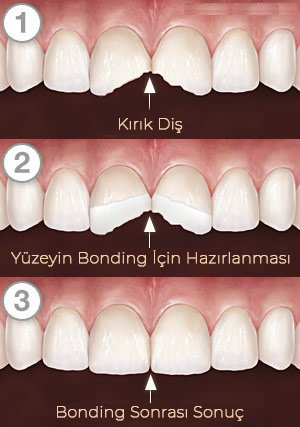 Bonding; Çürük, kırık, çentikli ya da renkleşmiş dişlerin, diş rengindeki kompozit rezin materyali ile onarılmasıdır. Bonding uygulaması sıklıkla diş aralıklarını kapatmakta kullanılır. Bir kaç dişin yada bir dişin aralıklarının kapatılmasında çok başarılı bir yöntemdir.
